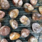 Bloemagaat is meestal zacht van kleur van roze of beige en bevat lichte chalcedooninsluitsels en deze lijken op bloemetjes. De Bloemagaat werkt op een zachte, rustgevende en voedende energie. Is kalmerend, troostend en opbeurend. Deze steen helpt je om stress, zorgen, angsten en spanningen los te laten en verzacht emotionele pijn en oud zeer. Omdat deze steen helpt om negatieve emoties en spanningen los te laten, geeft het lucht en maakt ruimte voor positieve veranderingen, optimistisch, (eigen)liefde en groei. Bloemagaat is een aardende, beschermende en kalmerende steen. Hij staat voor groei en helpt je dromen waar te maken en deze met passie en toewijding te manifesteren en het leven ten volle te leven. Heeft een troostende werking en stimuleert geluk. Deze steen heeft ook een vrouwelijke energie, wat het gevoel brengt van veiligheid en om thuis te zijn. Verwijdert negativiteit in een ruimte. Harmoniseert yin en yang en breng energieën in evenwicht.